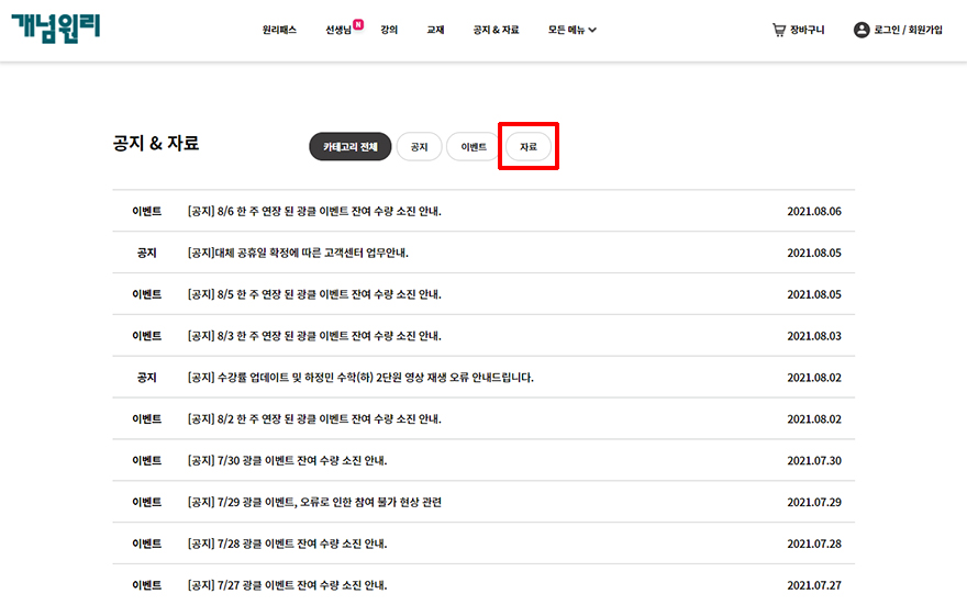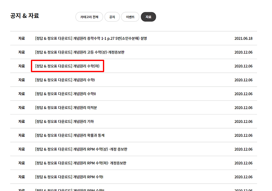 개념원리 사이트의 공지&자료 페이지로 들어오면 먼저 카테고리 전체가 먼저 선택되어있어서 여러 글이 보이는데요. 여기에서 교재들의 답지나 기타 자료 등을 보고싶다면 상단에 있는 자료 버튼을 눌러 필터링하면 됩니다.