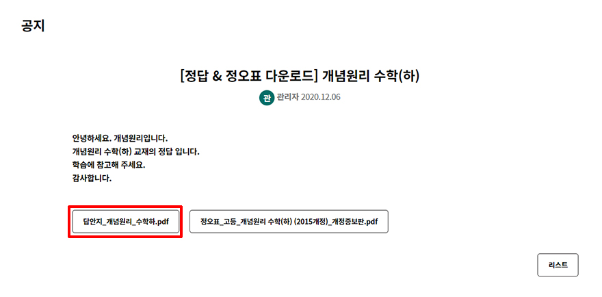 눌러보니 목록에 있는 글들이 자료만 나오기 시작하는데요. 여기에서 정답 & 정오표 다운로드라고 붙어있는 것들을 보시면 됩니다. 그리고 우리가 찾는 개념원리 수학(하)를 눌러서 들어갑시다.