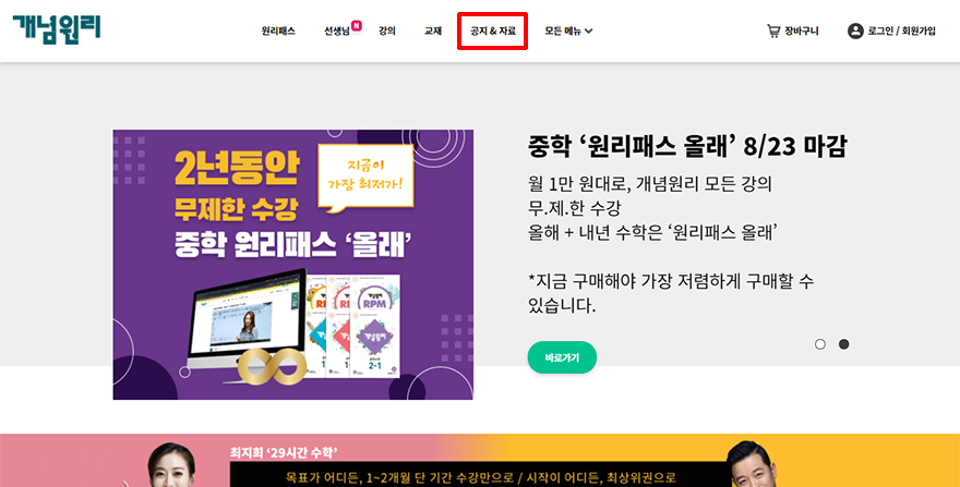 해당 교재의 자료를 받기위해서는 개념원리 홈페이지인 이곳으로 들어가셔야 합니다. 사이트에 들어온 이후에는 상단에 있는 메뉴를 보시면 됩니다. 다섯번째에 공지&자료 부분을 누르시면 여러 자료들을 알아볼 수 있습니다.