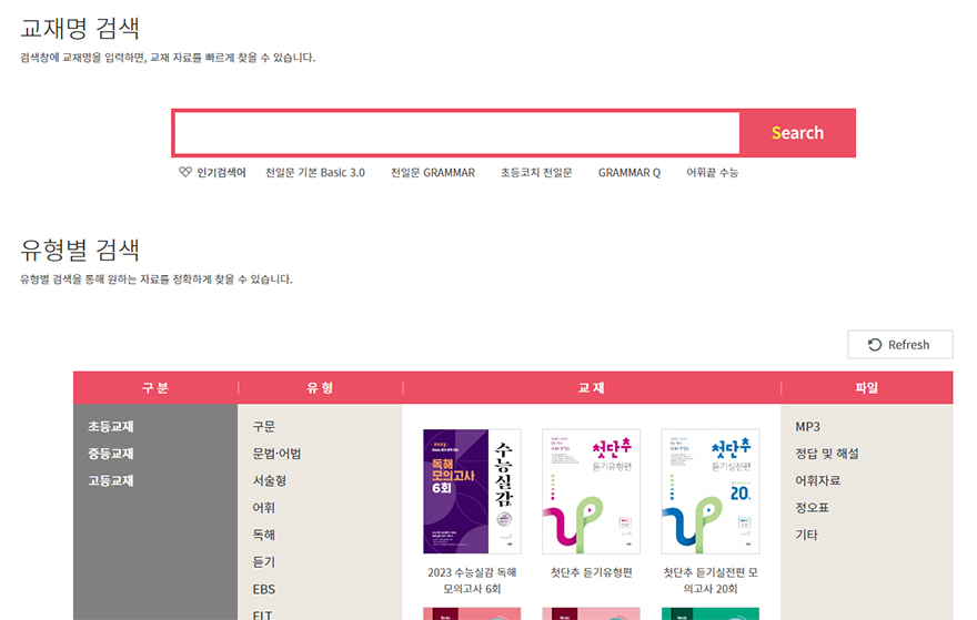 검색을 해보면 이렇게 찾아서 다운로드 받을 수 있도록 각 자료들이 게시글처럼 나열되어있는데요. 정답 및 해설에 있는 자세히 보기 버튼을 누르면 됩니다. 추가로 정오표나 어휘리스트, 어휘테스트, 예문영작연습지같은 자료도 받을 수 있습니다.