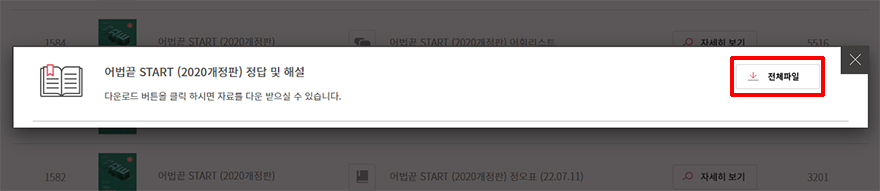 자세히보기를 누르면 이렇게 어법끝 START (2020개정판) 정답 및 해설이라는 팝업이 나오면서 우측에 보이는 전체파일 버튼을 클릭할 경우 받아지는데요. pdf 형식으로 내려받을 수 있으며 클릭한 뒤 실행하여 보면 됩니다.